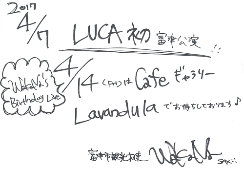 4/14(金)にCafe Gallery Lavandulaで行うLUCAのバースデーライブや、