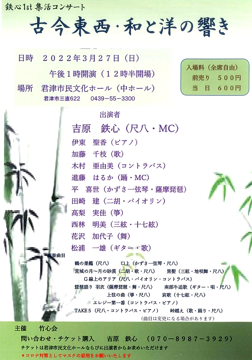 2022 年 3 月 18 日 金曜日竹心会・吉原鉄心さんに、3/27(日)に君津市民文化ホールで開催する